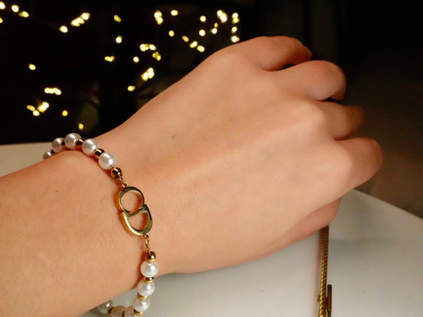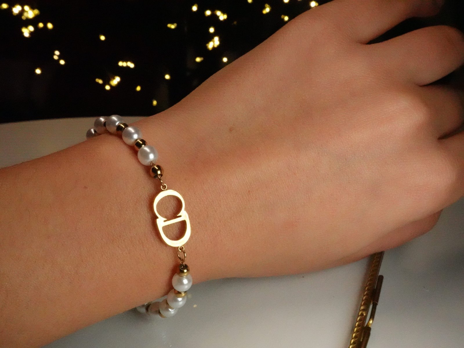 Bijou raffiné composé de perles blanches brillantes associées à des détails dorés élégants, avec un pendentif central style initiales “CD” au design minimaliste et chic.