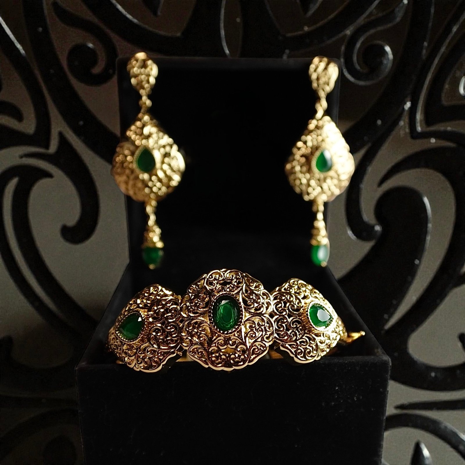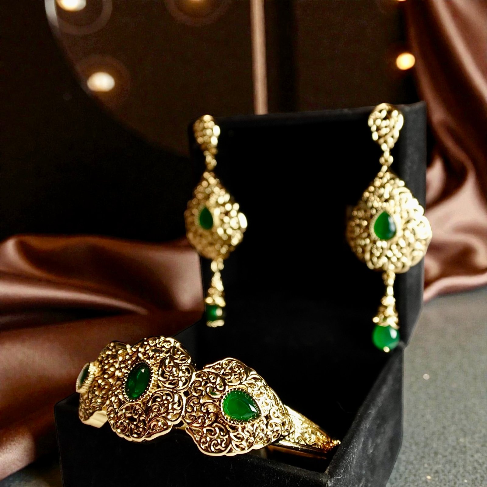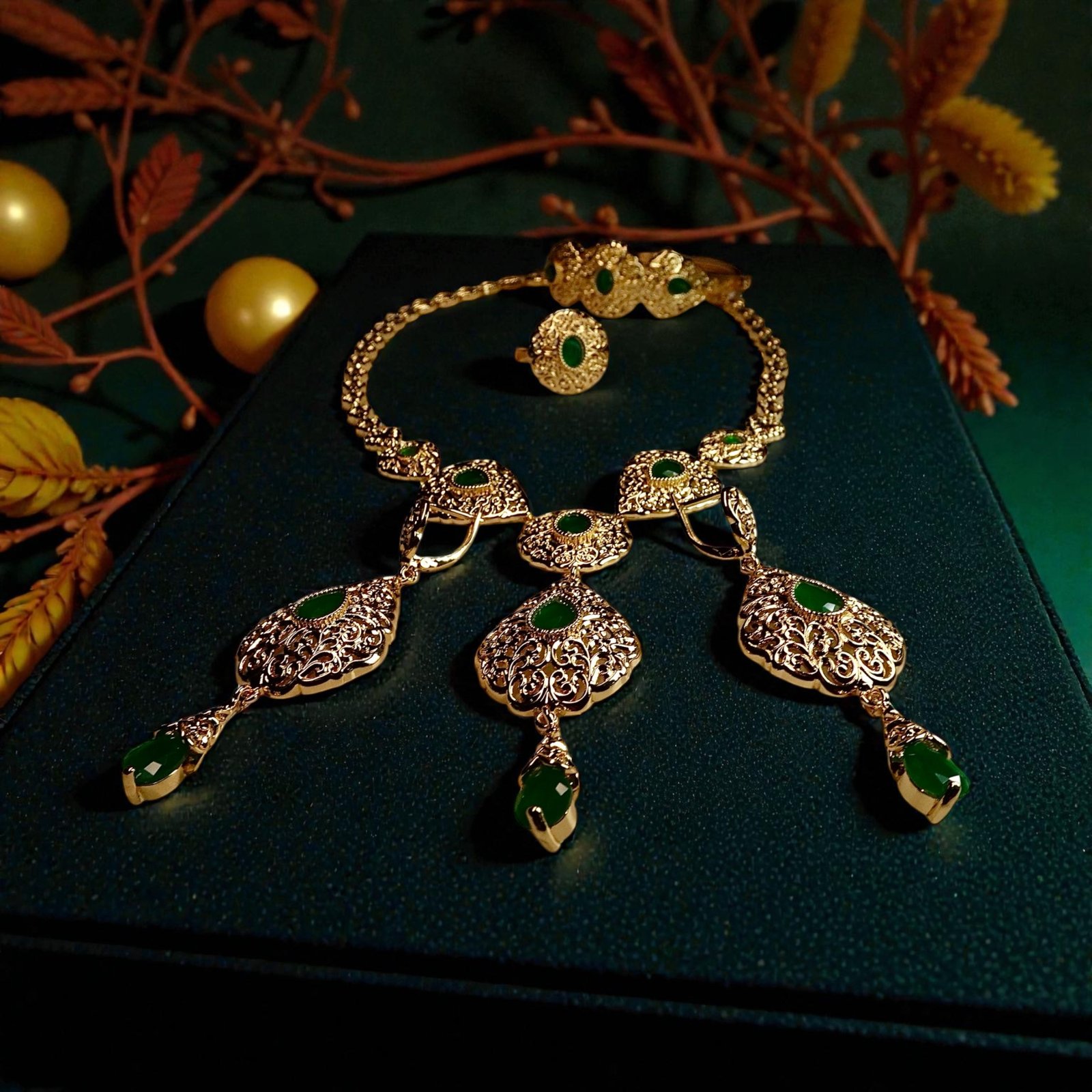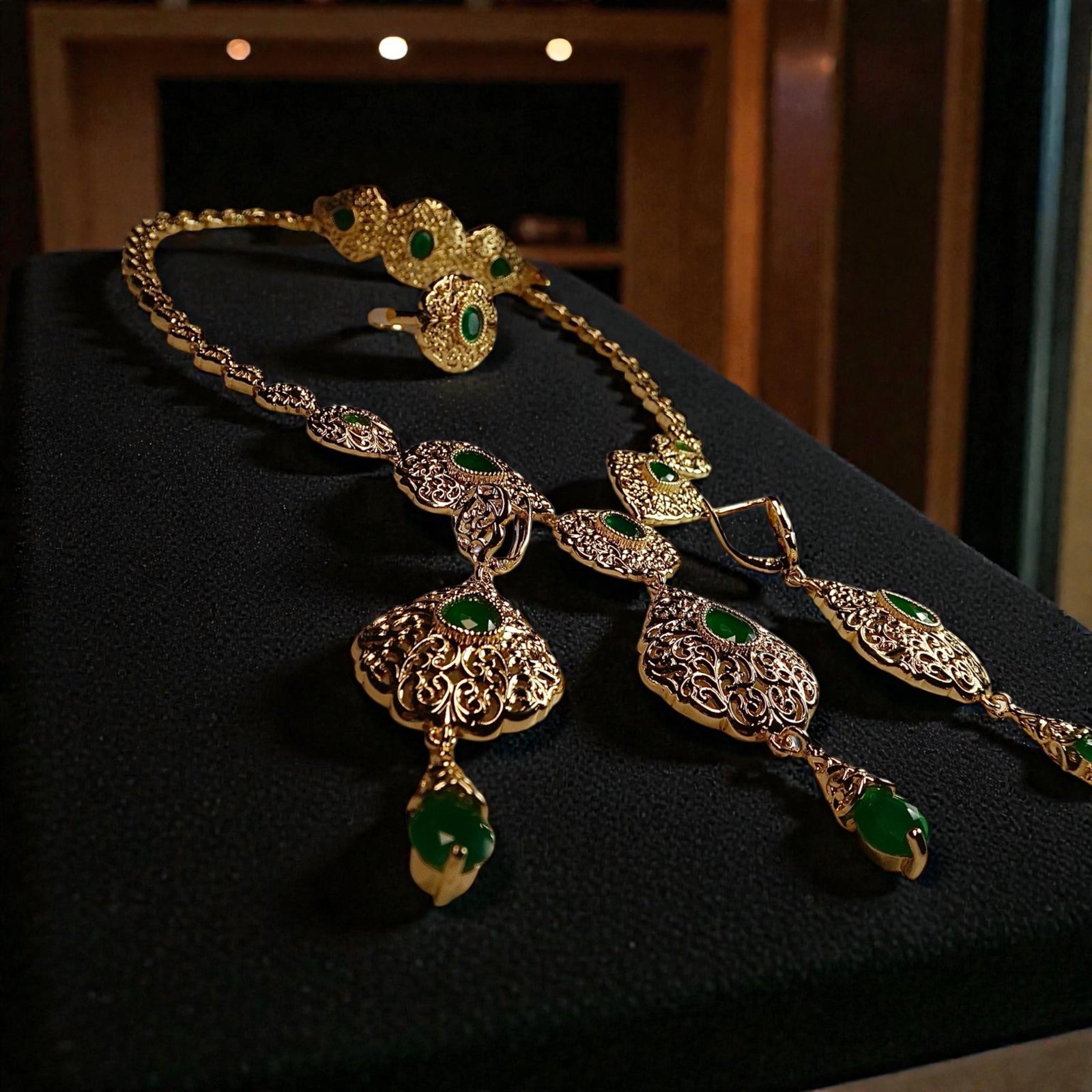 Sublime parure complète au design raffiné et luxueux, composée d’un collier, d’un bracelet, d’une bague et d’une paire de boucles d’oreilles assorties.